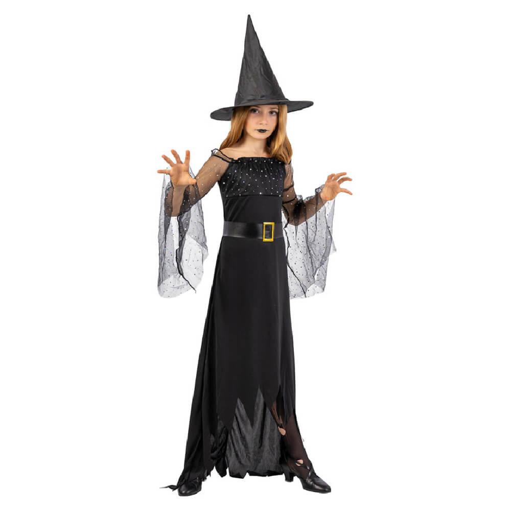 Kostum je narejen iz 100% poliestra in je sestavljen iz enodelne obleke, katere spodnji del predstavlja dolgo črno krilo. Krilo je obogateno še z dodatnim pasom, ki odlično popestri samo obstojnost in izgled tega kostuma. Zgornji del pa predstavlja majica z dolgimi prosojnimi rokavi, ki imajo vključen motiv črnih pik. Poleg kostuma pa v pakiranju prejmete tudi čarovniški klobuk, ki bo popestril ta kostum.